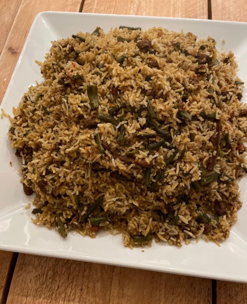 - In a large pot, layer some meat and lubia mixture at the bottom, followed by a layer of rice.